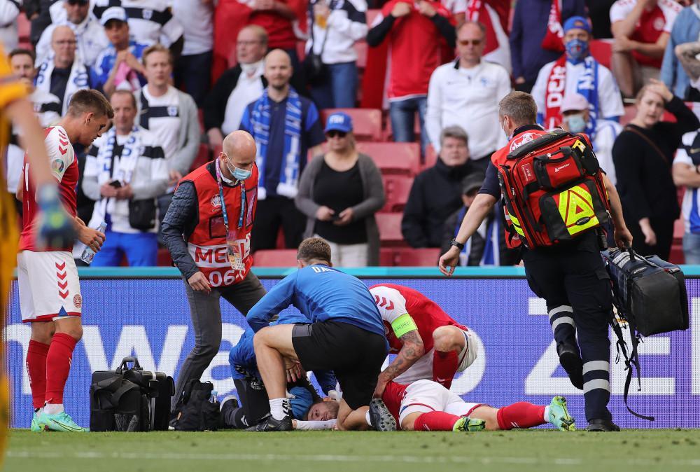 Το ματς διακόπηκε στο 42ο λεπτό μετά από αιφνίδια πτώση του διεθνούς άσου της Δανίας και για τουλάχιστον 15 λεπτά του παρασχέθηκαν οι πρώτες βοήθειες για να μην χάσει τη ζωή του, ενώ χρησιμοποιήθηκε και απινιδωτής. Οι παίκτες των δύο ομάδων ξέσπασαν σε κλάματα, όπως και στις εξέδρες υπήρξε παγωμάρα.