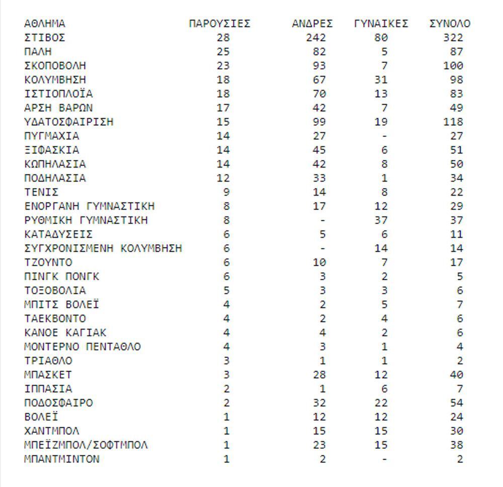* Η διαφορά στο άθροισμα των ανδρών (1.006 αντί 1.019) και του συνόλου των αθλητών (1.367 αντί 1.380), οφείλεται στο ότι 13 άνδρες αθλητές έχουν πάρει μέρος σε περισσότερα από ένα αθλήματα.