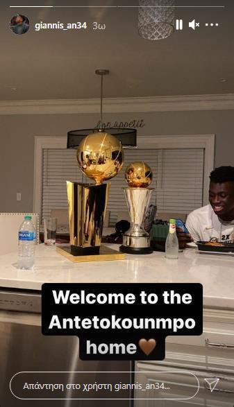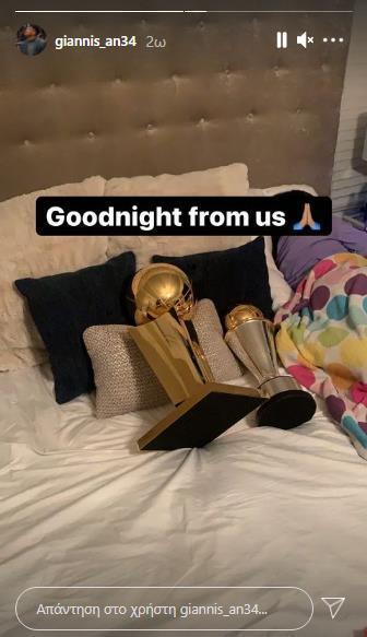 Ο ίδιος έκανε γνωστό το γεγονός με τις πρώτες αναρτήσεις του μετά την κατάκτηση του πρωταθλήματος με τους Μιλγουόκι Μπακς, αφού ανέβασε σε stories δύο φωτογραφίες από το σπίτι του, με τα τρόπαια αρχικά στο τραπέζι (και δίπλα στον αδερφό του Άλεξ) και στη συνέχεια στο κρεβάτι. Το… όνειρο το έζησε όμως ξύπνιος.