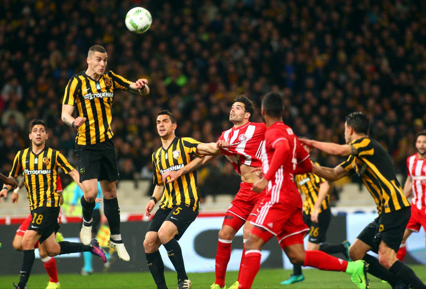 Ο Ολυμπιακός γλίτωσε ένα “άδικο” γκολ στο 30, αλλά στην αμέσως επόμενη φάση η ΑΕΚ άνοιξε το σκορ. Το σκληρό μαρκάρισμα του Μποτία πάνω στον Πατίτο, ήταν φάουλ έξω από την περιοχή (και κίτρινη στον σέντερ-μπακ του Ολυμπιακού). Το φάουλ ανέλαβε να εκτελέσει ο Αϊντάρεβιτς, ο Ντα Κόστα έβαλε λάθος το κεφάλι του και η μπάλα πήγε στην αντίθετη πορεία από κεί που έπεφτε ο Λεάλι: 1-0 μέσα σε πανδαιμόνιο και αποβολή του … Φρασνουά Μοδεστό, από τον πάγκο των “ερυθρολεύκων”