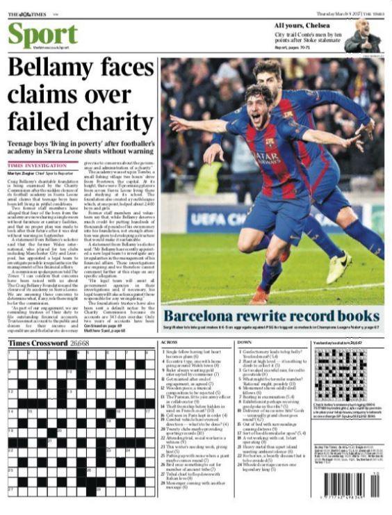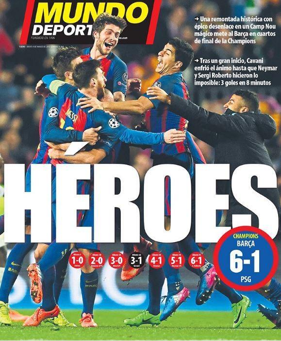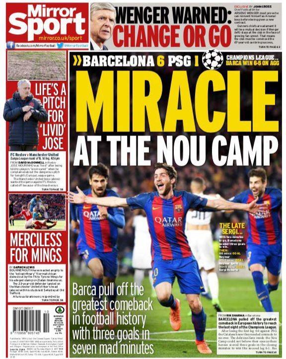 «Θαύμα στο Καμπ Νου» γράφει στο οπισθόφυλλο της η Mirror, ενώ οι Times τονίζουν: «Η Μπαρτσελόνα ξαναγράφει τα βιβλία των ρεκόρ».