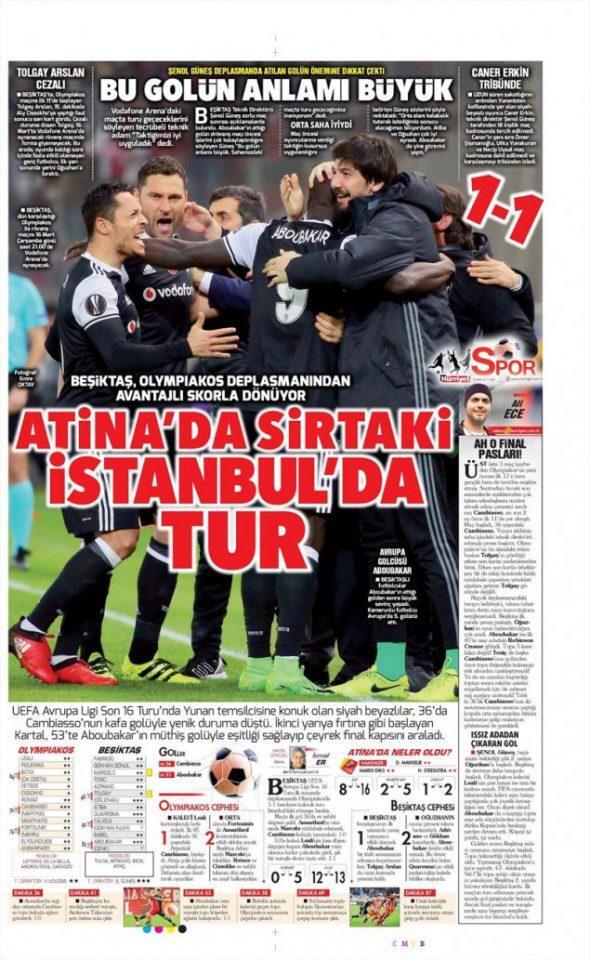 Η εφημερίδα «Hurriyet» αναφέρει στο πρωτοσέλιδο της… «Στην Αθήνα συρτάκι, στην Κωνσταντινούπολη πρόκριση», ενώ η «Vatan» κάνει λόγο για τελειωμένη πρόκριση, γράφοντας… «Ο προημιτελικός εμφανίστηκε…»!