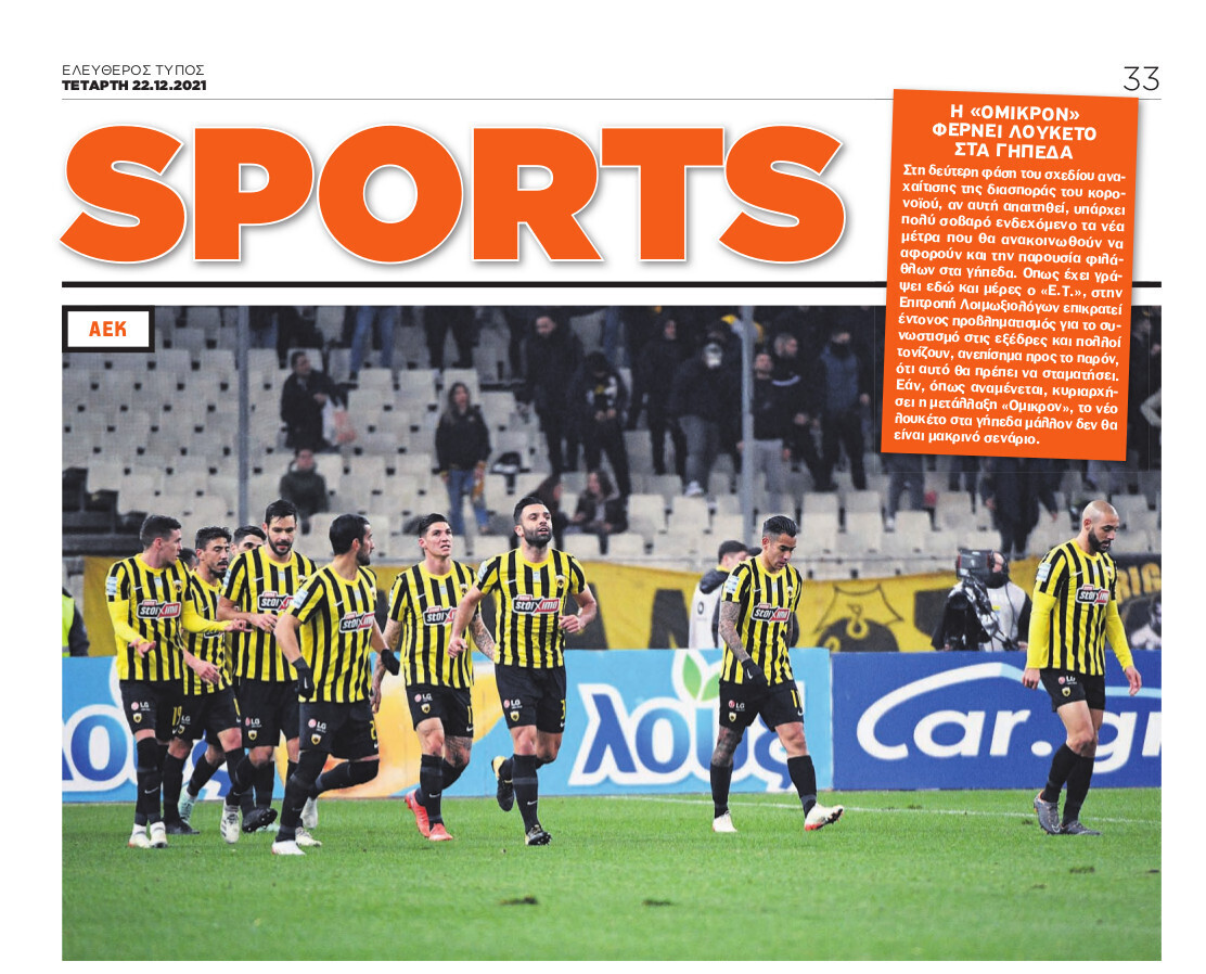 Οπως έχει γράψει εδώ και μέρες ο «Ε.Τ.», στην Επιτροπή Λοιμωξιολόγων επικρατεί έντονος προβληματισμός για το συνωστισμό στις εξέδρες και πολλοί τονίζουν, ανεπίσημα προς το παρόν, ότι αυτό θα πρέπει να σταματήσει. Εάν, όπως αναμένεται, κυριαρχήσει η μετάλλαξη «Ομικρον», το νέο λουκέτο στα γήπεδα μάλλον δεν θα είναι μακρινό σενάριο.