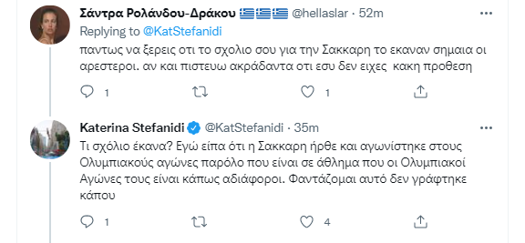 Μάλιστα, στη συνέχεια, απαντώντας σε ακόλουθό της σχετικά με την Μαρία Σάκκαρη, έγραψε: «Εγώ είπα ότι η Σάκκαρη ήρθε και αγωνίστηκε στους Ολυμπιακούς αγώνες παρόλο που είναι σε άθλημα που οι Ολυμπιακοί Αγώνες τους είναι κάπως αδιάφοροι. Φαντάζομαι αυτό δεν γράφτηκε κάπου».
