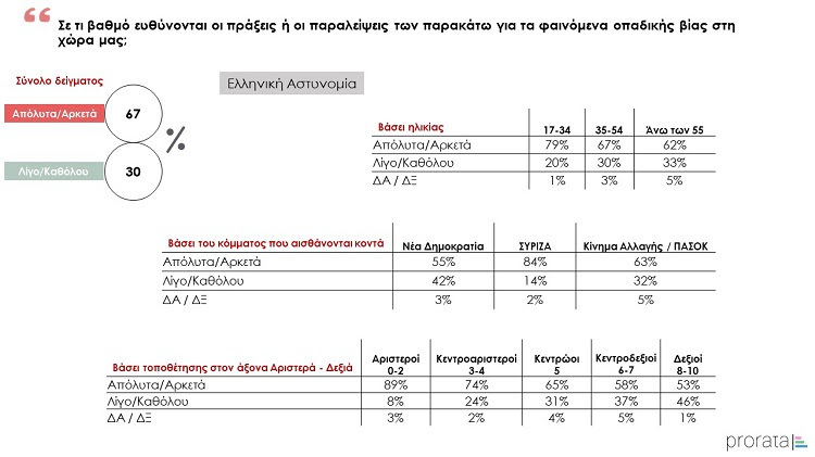 Η αντίδραση της πολιτείας μετά τη δολοφονία του 19χρονου Άλκη ως προς την αντιμετώπιση της οπαδικής βίας, αξιολογείται με αρνητικό πρόσημο από την πλειονότητα των συμμετεχόντων. Ειδικότερα, το 36% χαρακτηρίζει ως «υποκριτική» την αντίδραση της πολιτείας, το 20% ως «ανεπαρκή» και το 5% ως «καθυστερημένη». Αντίθετα, το 20% χαρακτηρίζει την αντίδραση ως «ικανοποιητική», το 17% ως «άμεση» και μόλις το 1% ως «ελπιδοφόρα». Τέλος, παρατηρείται και σχετική διαφοροποίηση των απαντήσεων στη βάση της κομματικής εγγύτητας των πολιτών. Πιο συγκεκριμένα, η μεγαλύτερη μερίδα όσων αισθάνονται εγγύτερα στον ΣΥΡΙΖΑ (60%) και το Κίνημα Αλλαγής/ΠΑΣΟΚ (36%) θεωρεί «υποκριτική» την αντίδραση της πολιτείας γύρω από την αντιμετώπιση της οπαδικής βίας, ενώ αντίθετα η μεγαλύτερη μερίδα όσων αισθάνονται πιο κοντά στη Νέα Δημοκρατία (42%) χαρακτηρίζει την αντίδραση της πολιτείας ως «άμεση».