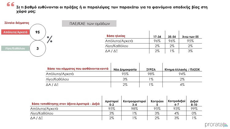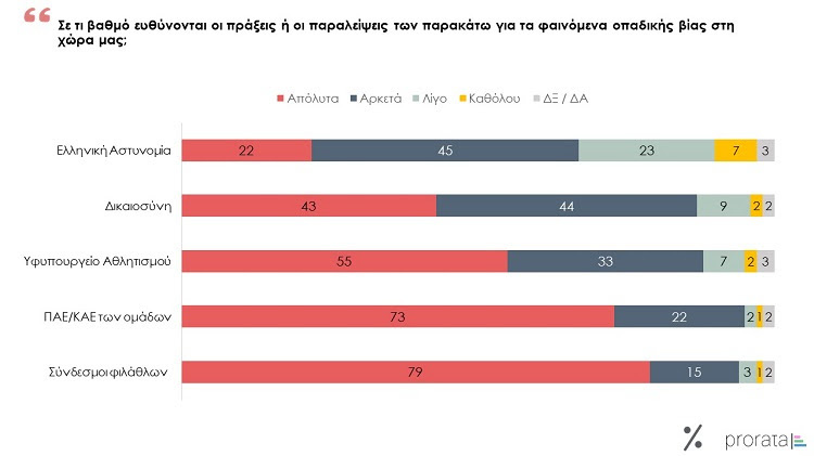 Συγκεκριμένα, το 96% θεωρεί ότι οι ΠΑΕ/ΚΑΕ των ομάδων έχουν μεγάλη ή αρκετά μεγάλη ευθύνη για τα φαινομένα οπαδικής βίας, ποσοστό το οποίο φτάνει το 95% ως προς τους συνδέσμους φιλάθλων (95%). Ακολουθεί το Υφυπουργείο Αθλητισμού, με ποσοστό 88%, ενώ σημαντικές ευθύνες αποδίδονται και στη Δικαιοσύνη (77%), με το 43% να θεωρεί ότι ευθύνεται σε απόλυτο βαθμό και το 44% να της αποδίδει αρκετά μεγάλο μερίδιο ευθύνης. Τέλος, μικρότερες ευθύνες φαίνεται πως αποδίδονται στις πράξεις ή τις παραλείψεις της Ελληνικής Αστυνομίας, καθώς παρά το γεγονός πως της αποδίδεται αθροιστικά μεγάλη ή αρκετή ευθύνη σε ποσοστό 77%, η αναλογία μεταξύ του μεγάλου και του αρκετού είναι σαφώς υπέρ του δεύτερου.