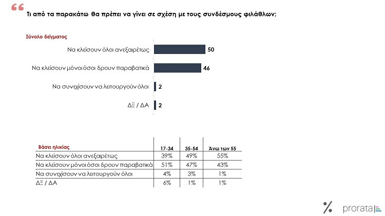 Σχετικά με τη διαχείριση των συνδέσμων των φιλάθλων, η κοινή γνώμη μοιάζει σχετικά μοιρασμένη μεταξύ δύο απόψεων. Μια μεγάλη μερίδα διατηρεί την άποψη πως οι παρεμβάσεις σε αυτούς θα πρέπει να είναι δραστικές με το οριστικό κλείσιμο τους (49%) και μια άλλη εξίσου μεγάλη μερίδα ότι θα πρέπει να κλείνουν οριστικά μόνο όσοι εξ’ αυτών δρουν παραβατικά (46%). Παράλληλα, μόλις το 2% τάσσεται με την άποψη ότι οι σύνδεσμοι των φιλάθλων πρέπει να συνεχίσουν να λειτουργούν κανονικά ως έχει, ενώ τέλος ενδιαφέρον παρουσιάζει το εύρημα σύμφωνα με το οποίο οι μεγαλύτερες ηλικιακές κατηγορίες επιθυμούν αυστηρότερα μέτρα απέναντι στους συνδέσμους φιλάθλων συγκριτικά με τις μικρότερες ηλικιακές κατηγορίες.