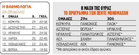 Σε δύσκολη θέση βρίσκεται η Λάρισα μετά τα τελευταία αποτελέσματα. Υποβιβάζεται αν: α) συγκεντρώσει τρεις βαθμούς και ο Λεβαδειακός κάνει δύο νίκες, β) σε περίπτωση που φέρει τα ίδια αποτελέσματα με τον Ηρακλή, αλλά δεν καταφέρει να τον προσπεράσει στα γκολ και ο Λεβαδειακός προσπεράσει και τους δύο. Η ΑΕΛ υποδέχεται την Ξάνθη στις 23 Απριλίου και δοκιμάζεται στη Λεωφόρο μία εβδομάδα αργότερα κόντρα στον Παναθηναϊκό.