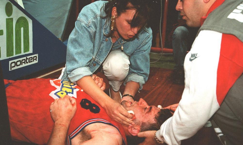 ΣΟΚ! Πέφτει αιμόφυρτος στο παρκέ, αλλά κανείς δεν είχε καταλάβει εκείνη τη στιγμή τη σοβαρότητα του τραυματισμού. Και η ειρωνεία; Στην μπασκέτα δεν είχε τοποθετηθεί ακόμα το προστατευτικό που είχε ήδη αρχίσει να χρησιμοποιείται για να καλύπτει τη βάση της. Ο Γιάνκοβιτς δεν μπορούσε να σηκωθεί…