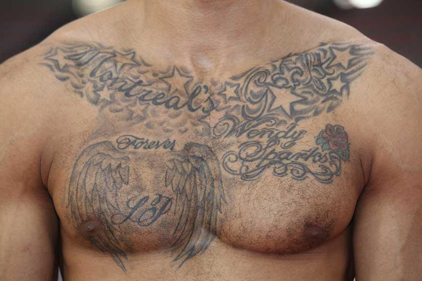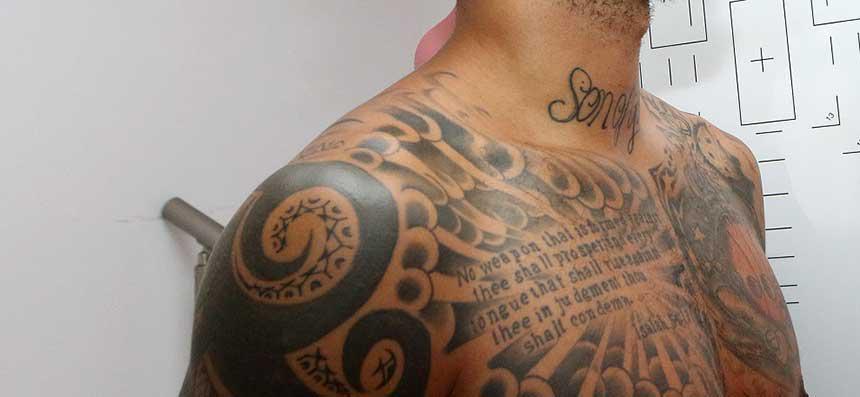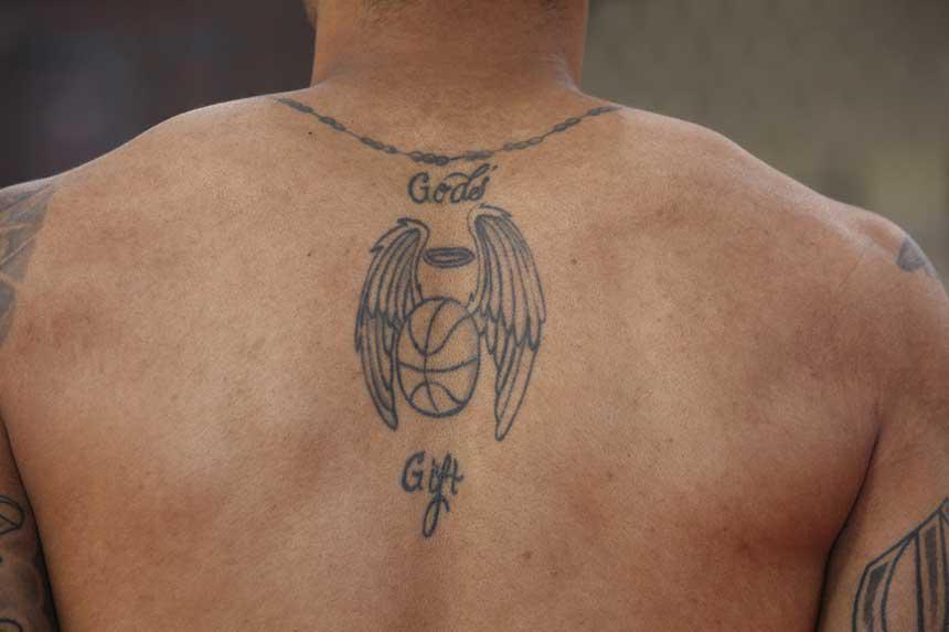 Και εδώ υπήρχε ανάλογο πρόβλημα με αυτό που αντιμετωπίσαμε με τον Γιώργο Πρίντεζη. Αλλά ο Αμερικανός ήταν πιο διαλλακτικός και αφού έκανε μια γρήγορη καταμέτρηση, εξήγησε γιατί είναι 15. Το πρώτο του το έκανε στα 18 και σχεδόν γέμισε τη μισή του πλάτη. Κάθε ένα από αυτό έχει το δικό του νόημα και κανένα δεν είναι απλό σχέδιο. Τα περισσότερα σχετίζονται με την οικογένεια του, μερικά εξ αυτών συμβολίζουν και του θυμίζουν την γειτονιά στην οποία μεγάλωσε, ένα όνομα ενός πολύ αγαπημένου του προσώπου που έφυγε πρόωρα από τη ζωή και ακόμη ένα που σχετίζεται με το μπάσκετ.