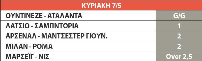 Στο αγγλικό ντέρμπι ανάμεσα στην Αρσεναλ και την Μάντσεστερ Γιουνάιτεντ θα στηρίξουμε τους φιλοξενούμενους όσο και αν η ομάδα του Βενγκέρ τον τελευταίο καιρό δείχνει κάποια καλά σημάδια. Στην Ιταλία η Ρόμα καλείται να περάσει το σοκ της ήττας από την Λάτσιο και πιστεύουμε ότι μπορεί να το κάνει απέναντι στην Μίλαν. Ο «άσος» θα είναι η πρότασή μας για το ματς της Λάτσιο με την Σαμπντόρια και το G/G στο Ουντινέζε-Αταλάντα. Πολλά γκολ αναμένουμε στο Μαρσέιγ-Νις.