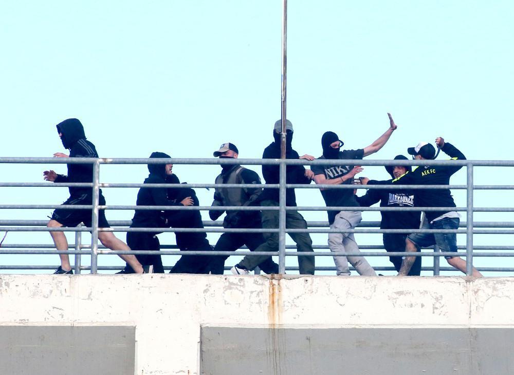 Τα ΜΑΤ μπήκαν στη μέση προκειμένου να σταματήσουν οι συγκρούσεις αλλά δεν υπολόγισαν σωστά αφού οι οπαδοί της ΑΕΚ ανέβηκαν στην αερογέφυρα που ενώνει τις κερκίδες και να πετάξουν αντικείμενα στους οπαδούς του ΠΑΟΚ, σύμφωνα με το gazzetta.gr.