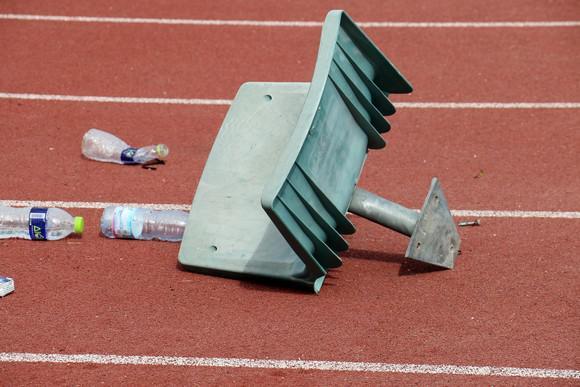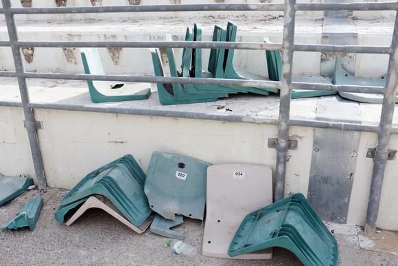 Σπασμένα καθίσματα, λουκέτα, κάγκελα, τούβλα, πυροσβεστήρες και ότι άλλο μπορεί να σκεφτεί κανείς συνθέτουν το σκηνικό στο Πανθεσσαλικό στάδιο μετά τον τελικό του Κυπέλλου ανάμεσα στην ΑΕΚ και τον ΠΑΟΚ.