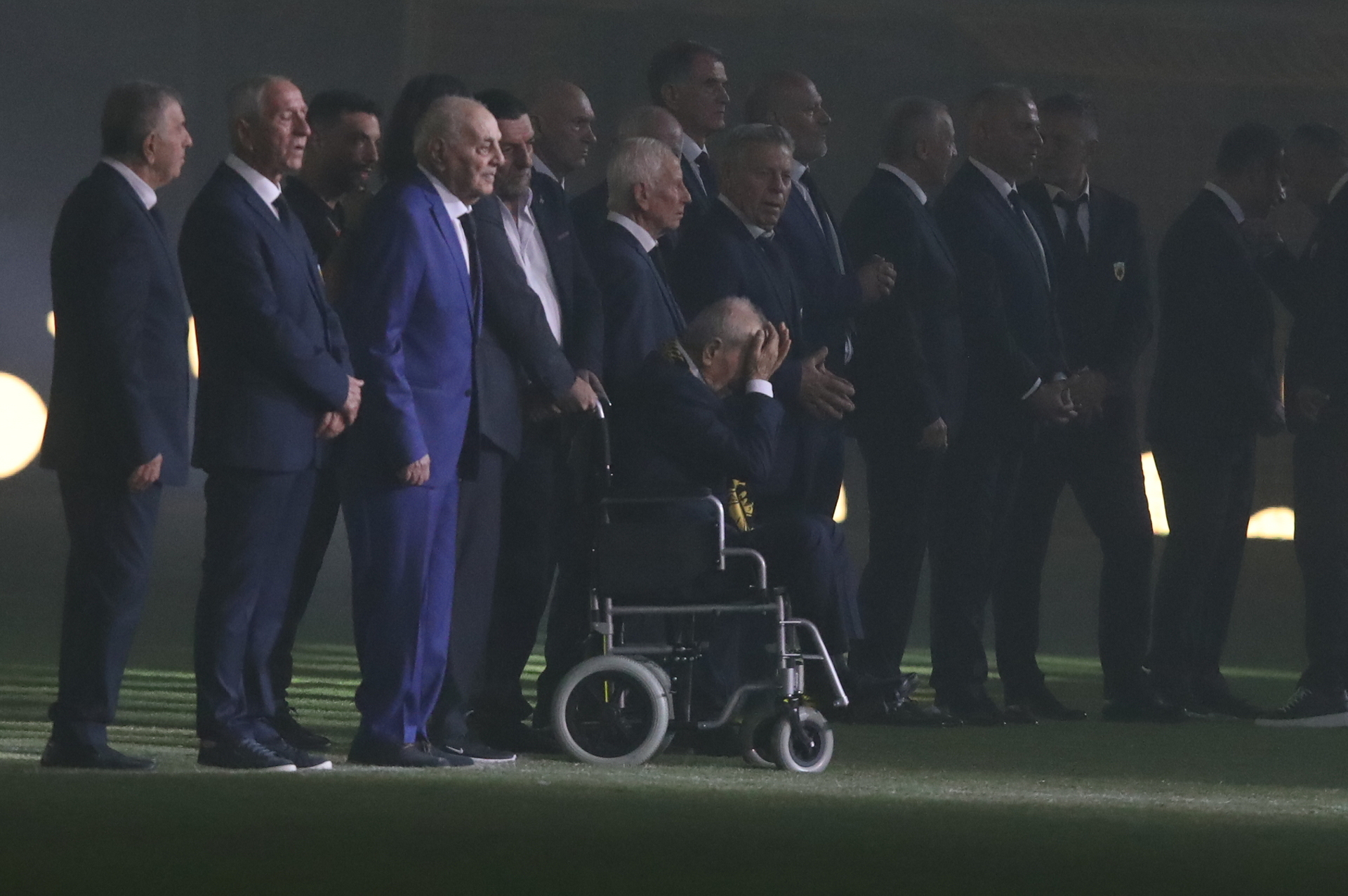 Ο παλαίμαχος άσος της ΑΕΚ Κώστας Νεστορίδης μπήκε στον αγωνιστικό χώρο της Opap Arena συνοδευόμενος από την οικογένειά του.