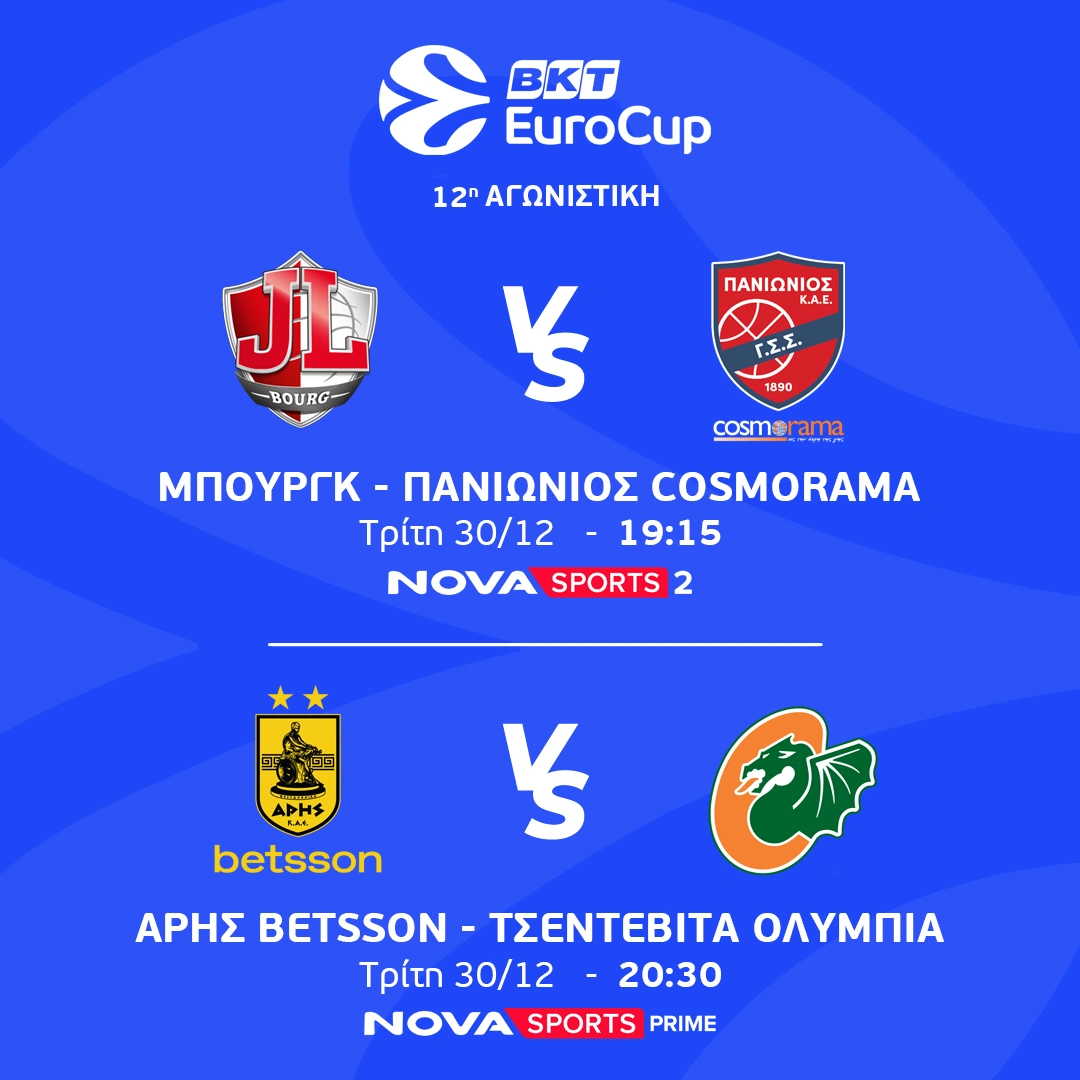To EuroCup συνεχίζεται με την 12η αγωνιστική και τους αγώνες Μπουργκ-Πανιώνιος Cosmorama Travel (30/12, 19:15) & Άρης Betsson-Τσεντεβίτα Ολίμπια (30/12, 20:30).