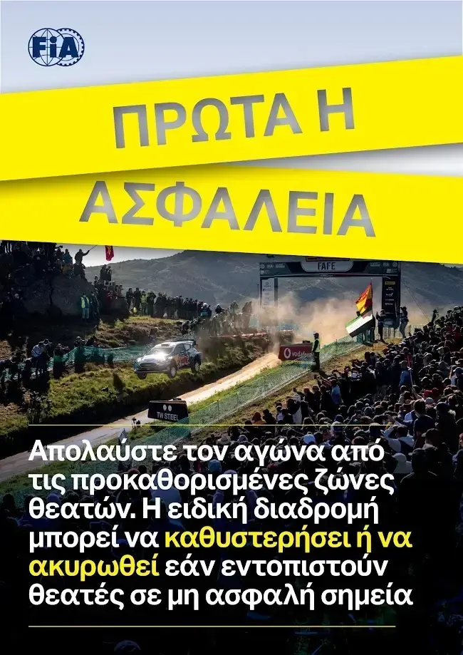 - Βρείτε το σημείο από όπου θα παρακολουθήσετε τον αγώνα τουλάχιστον 30 λεπτά πριν από την εκκίνηση του πρώτου αγωνιστικού αυτοκινήτου. Από εκεί και έπειτα, δε θα επιτρέπονται οι μετακινήσεις.