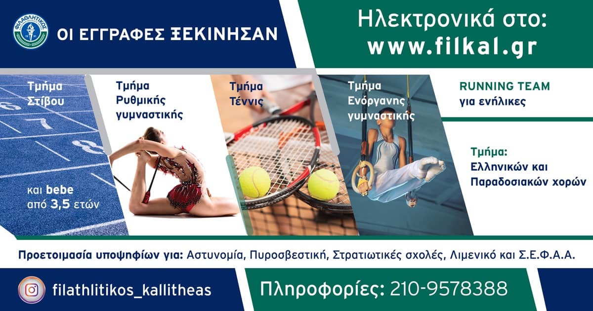 Οι εγγραφές για όλα τα τμήματα του Συλλόγου μας έχουν ανοίξει και πραγματοποιούνται μέσα από το www.filkal.gr και από τα γραφεία μας στο Δημοτικό Στάδιο Καλλιθέας καθημερινά Δευτέρα έως Παρασκευή και ώρες 17:30-19:30 (τηλ.επικ.: 210-9578388).