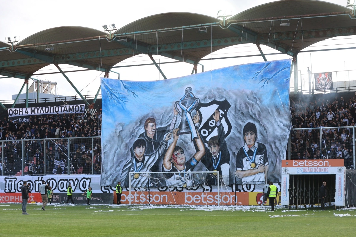 Ειδικότερα, οι γηπεδούχοι θυμήθηκαν τον τελευταίο τίτλο της ομάδας τους, το Κύπελλο του 1987, δημιουργώντας ένα άκρως συγκινητικό κορεό, το οποίο υψώθηκε μπροστά από το πέταλο των οργανωμένων οπαδών του ΟΦΗ.