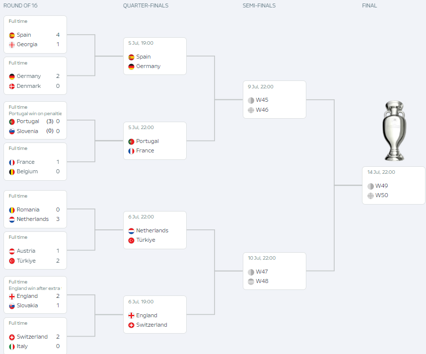 Ολοκληρώθηκε η φάση των «16» του EURO 2024. Η Τουρκία είναι η τελευταία ομάδα που έκλεισε τη θέση της στα προημιτελικά του τουρνουά της Γερμανίας και θα αντιμετωπίσει στον επόμενο γύρο την Ολλανδία. Η ομάδα που θα προκριθεί από αυτό το ζευγάρι θα αντιμετωπίσει στα ημιτελικά την Αγγλία ή την ομάδα έκπληξη του προηγούμενου γύρου, την Ελβετία, η οποία άφησε εκτός την κάτοχο του τροπαίου Ιταλία.