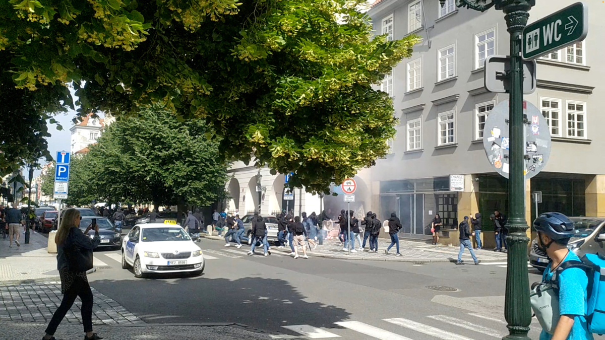 Ένα βίντεο στο Twitter δείχνει οπαδούς να ανάβουν φωτοβολίδες και να πετάνε τραπέζια στο μπαρ που βρίσκεται ακριβώς έξω από την πλατεία της Παλιάς Πόλης της Πράγας. Επίθεση δέχθηκε κι ένας αστυνομικός.