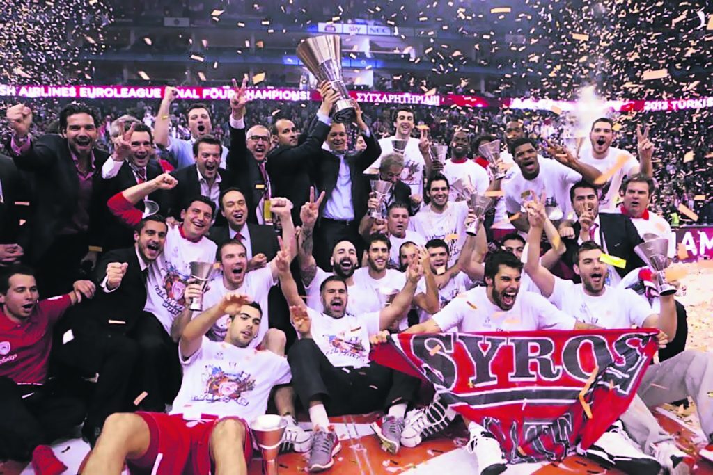 » Λονδίνο: Εναν χρόνο αργότερα, τον Μάιο του 2013, στο Λονδίνο, και με τον «κορμό» της ομάδας να παραμένει ο ίδιος (Σπανούλης, Πρίντεζης, Παπανικολάου, Χάινς, Μάντζαρης, Λο, Αντιτς κ.ά.), οι «ερυθρόλευκοι» κάνουν το «back to back» στους τίτλους με δύο επιβλητικές νίκες επί της ΤΣΣΚΑ (69-52) στον ημιτελικό και της Ρεάλ στον τελικό (100-88), με τον Σπανούλη να πετυχαίνει 22 πόντους με 5 τρίποντα. Ο Γιώργος Μπαρτζώκας, που είναι και σήμερα κόουτς των «ερυθρόλευκων», γίνεται στο Λονδίνο ο πρώτος Ελληνας προπονητής που κατακτά τίτλο Ευρωλίγκας.