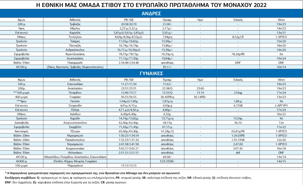 Πολύ καλή η Δήμητρα Γναφάκη, η οποία στο Ευρωπαϊκό έσπασε δύο φορές τα ατομικά της όρια στο (πολύ δύσκολο) αγώνισμα των 400 μ. εμπ. και «πέταγε» με την 4×400 μ., η Χριστίνα Παπαδοπούλου στο βάδην, η Σπυριδούλα Καρύδη στο τριπλούν (που κατέκτησε την 9η θέση).