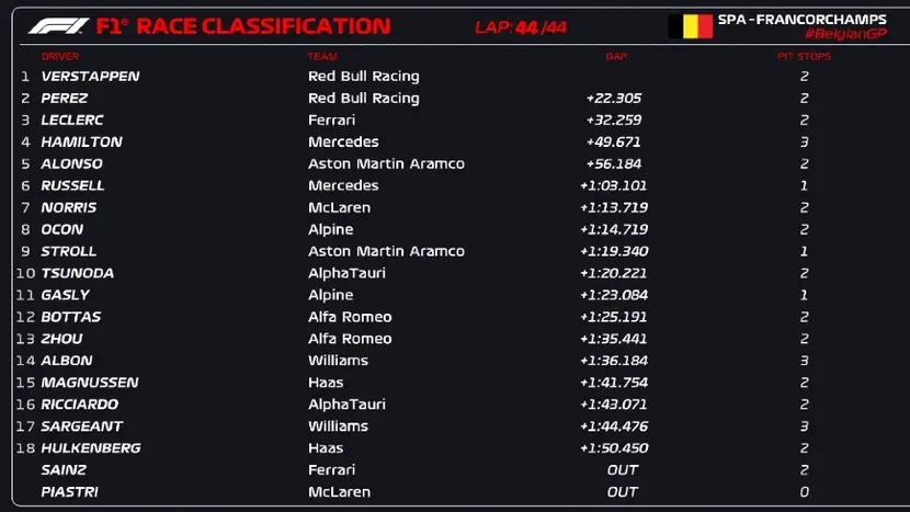 Στη 2η θέση τερμάτισε ο έτερος οδηγός της Red Bull Racing, Πέρεζ, ενώ το βάθρο έκλεισε με τον Λεκλέρ της Ferrari. Πιο πίσω, στην 4η θέση, ήταν Χάμιλτον και στην 5η ο Αλόνσο ενώ ακολούθησαν οι Τζορτζ Ράσελ, Λάντο Νόρις, Εστεμπάν Οκόν, Λανς Στρολ και Γιούκι Τσουνόντα.