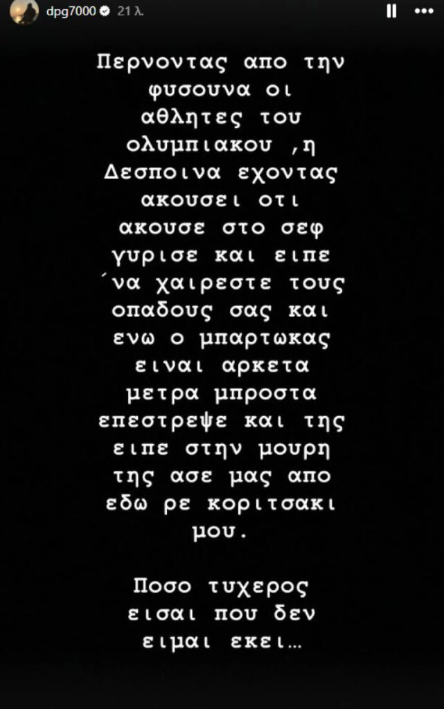Σύμφωνα με την ανάρτησή του, η Δέσποινα, παρούσα στο ΟΑΚΑ, απηύθυνε ειρωνικό σχόλιο προς την αποστολή του Ολυμπιακού, λέγοντας «να χαίρεστε τους οπαδούς σας», με αφορμή όσα είχαν ακουστεί στο ΣΕΦ. Ο προπονητής του Ολυμπιακού, αν και είχε ήδη απομακρυνθεί, φέρεται να επέστρεψε και να της απάντησε με τη φράση: «Άσε μας από εδώ, ρε κοριτσάκι μου».