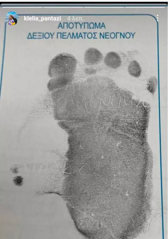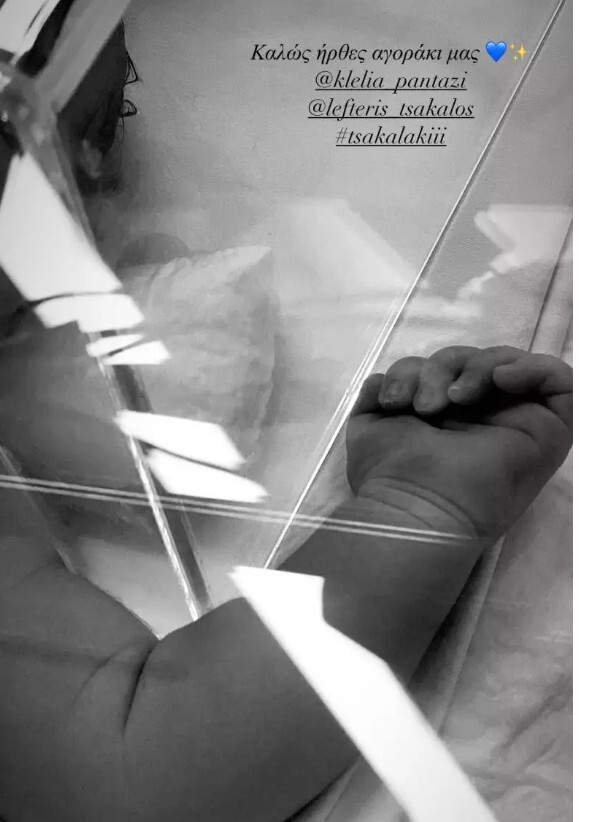 Δημοσιεύοντας στα Instagram Stories, μια φωτογραφία με το πέλμα το νεογέννητου μωρού της, αποκάλυψε τα γεννητούρια. Στο στιγμιότυπο επεσήμανε και τον σύζυγό της, Λευτέρη Τσάκαλο.
