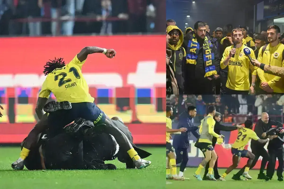 Fenerbahçe football club players provoke Trabzonspor fans at the end of the match and make fishing moves. Although the security forces neutralized the fans entering the field, Fenerbahçe football players attacked the fans with kicks and punches. UEFA and FIFA need to take action… pic.twitter.com/Jyl1WrUtOR