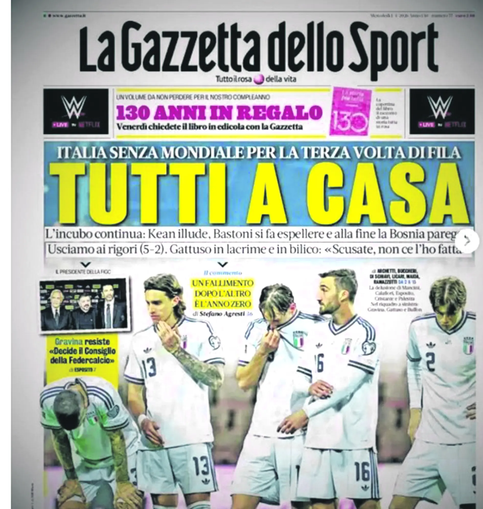 Οι γείτονες δεν θα πάνε στο Μουντιάλ των 48 ομάδων. Αν όχι τώρα, τότε πότε θα τα καταφέρουν; Η 4 φορές παγκόσμια πρωταθλήτρια θα μείνει εκτός φάσης Παγκοσμίου Κυπέλλου για τρίτη σερί φορά κι όπως ανέφερε η ίδια εφημερίδα «Χάθηκε η αίσθηση του σοκ με τον νέο αποκλεισμό, γιατί δεν ήταν μια απρόσμενη καταστροφή, αλλά μια κανονικότητα.