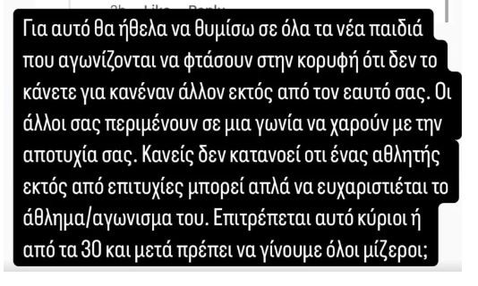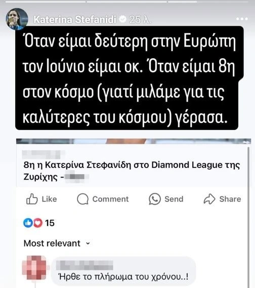 Η Στεφανίδη όμως, μετά από την 8η θέση που κατέλαβε στο Diamond League της Ζυρίχης απάντησε με stories στο Instagram ενώ απευθύνθηκε και στους νεότερους με ένα μήνυμά της.