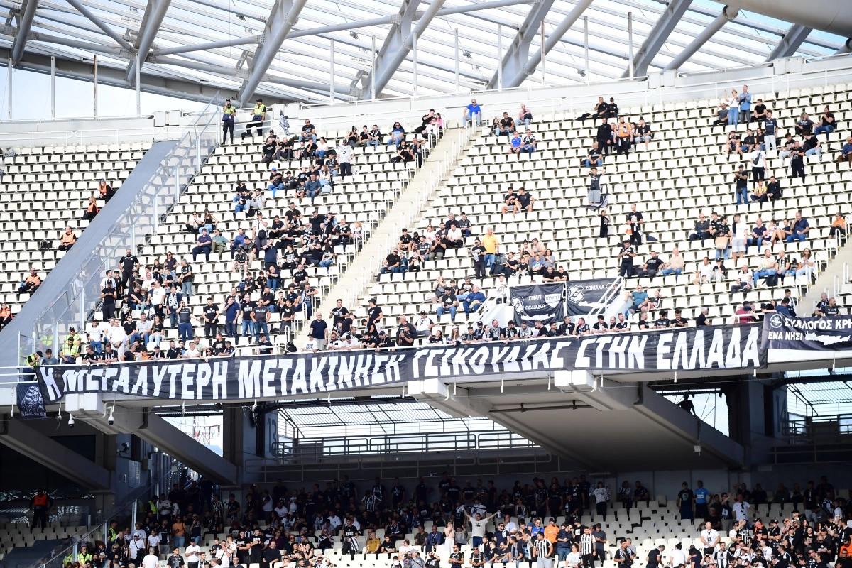 Οι φίλαθλοι του ΟΦΗ δίνουν δυναμικό «παρών» στο ΟΑΚΑ, ενώ στο στάδιο τοποθέτησαν ένα μοναδικό πανό, λίγη ώρα πριν τη σέντρα του αγώνα.