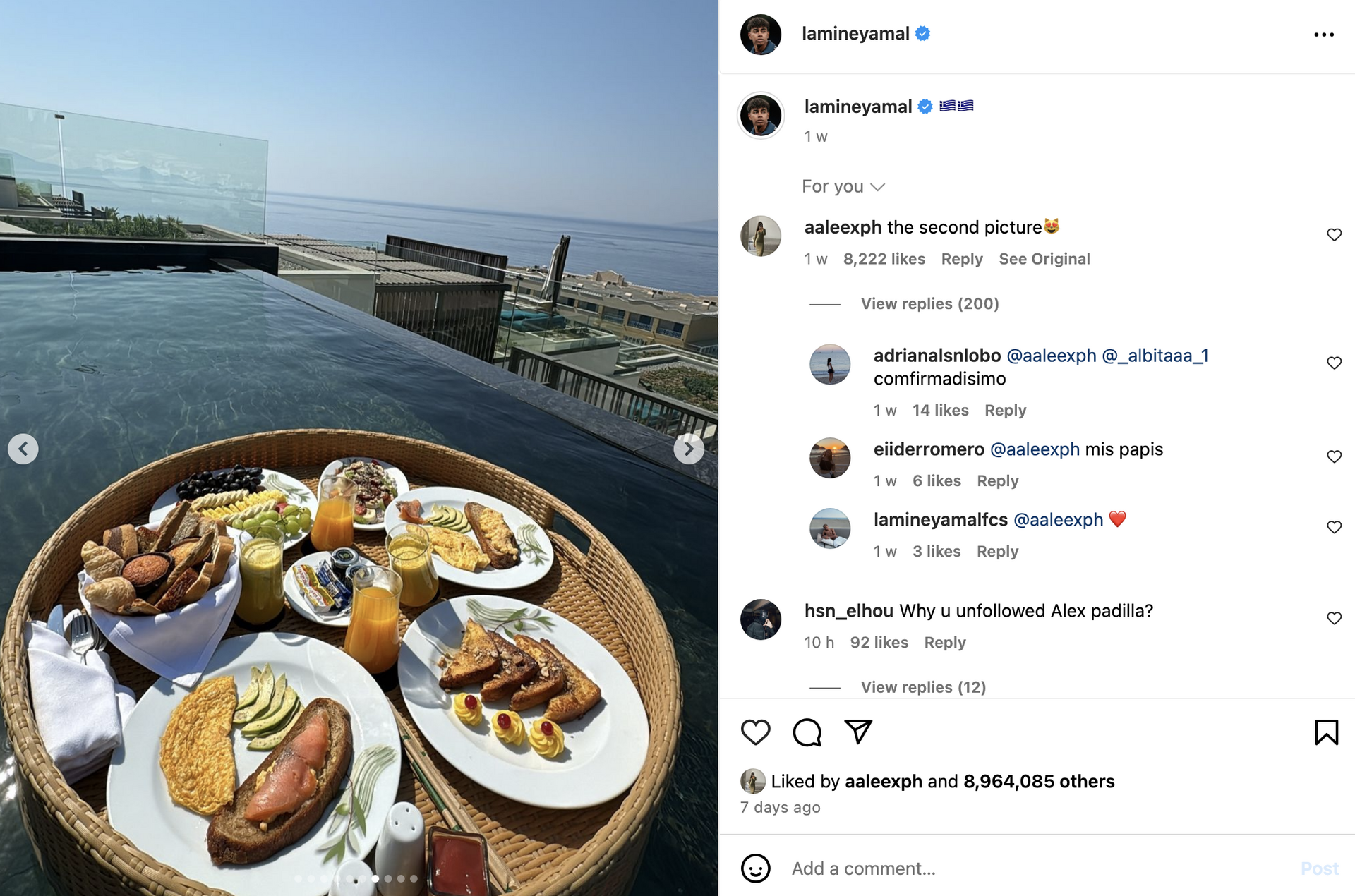 Ωστόσο, το επίσης 17χρονο παιδί θαύμα της FC Barcelona, Lamine Yamal, έχει κάνει πλέον unfollow την Άλεξ αφού εθεάθη να κάθεται στην αγκαλιά του Izan Fernández σε ένα viral βίντεο Instagram Live.