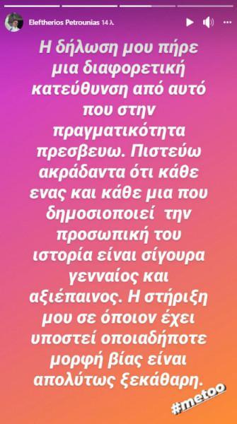 Με δύο στόρι του αναφέρει ότι η δήλωσή του πήρε διαφορετική κατεύθυνση από αυτό που στην πραγματικότητα πρεσβεύει και υπογραμμίζει ότι στηρίζει όσους έχουν υποστεί οποιαδήποτε μορφή βίας.