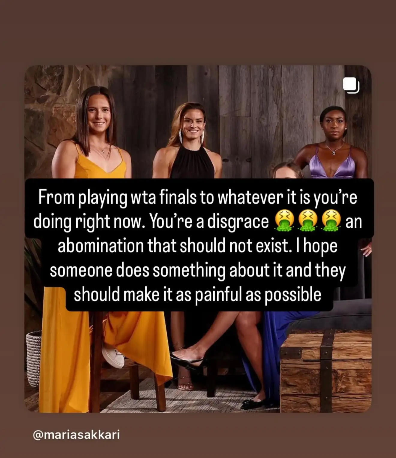 Μετά το τέλος του αγώνα, η κορυφαία Ελληνίδα τενίστρια έγινε στόχος απαράδεκτων και υβριστικών σχολίων, με κάποιους χρήστες να της στέλνουν ακόμη και ειδεχθή μηνύματα μίσους, φτάνοντας στο σημείο να της εύχονται τον θάνατο.