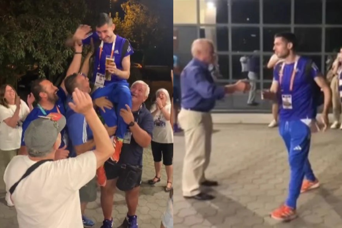 Σε βίντεο που αναρτήθηκε από τον ΣΕΓΑΣ ο παγκόσμιος πρωταθλητής πλησιάζει τον κόσμο που έχει συγκεντρωθεί να τον υποδεχτεί, αλλά παρακάμπτει τη χειραψία από τον πρώτο άνθρωπο που τον πλησιάζει και σπεύδει να χαιρετήσει ένα άλλο πρόσωπο.