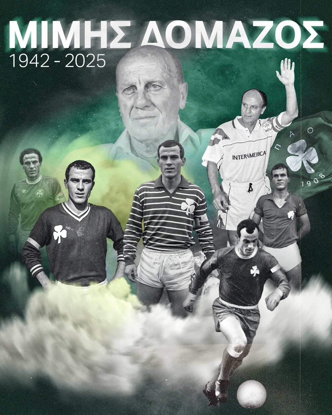 “Η ΚΑΕ Παναθηναϊκός AKTOR εκφράζει τη βαθύτατη οδύνη της για την απώλεια του «Στρατηγού», Μίμη Δομάζου, που έφυγε από τη ζωή σε ηλικία 83 ετών. Σύσσωμη η οικογένεια του Παναθηναϊκού πενθεί την απώλεια ενός σπουδαίου ποδοσφαιριστή, μα πάνω απ’ όλα μίας τεράστιας προσωπικότητας του ελληνικού αθλητισμού. Εκφράζουμε τα ειλικρινή μας συλλυπητήρια στην οικογένεια και τους οικείους του. Ας είναι ελαφρύ το χώμα που θα τον σκεπάσει. Μίμης Δομάζος. Στρατηγός. Αθάνατος”.