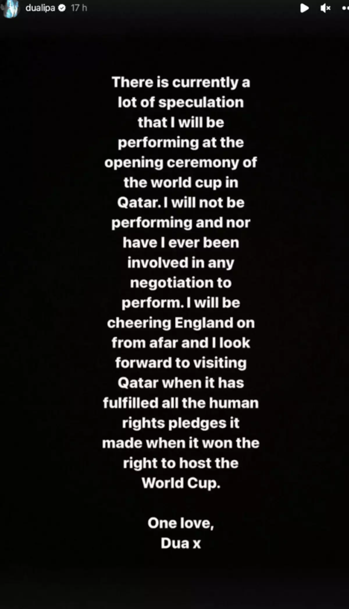 «Υπάρχουν πολλές εικασίες ότι θα εμφανιστώ στην τελετή έναρξης του Παγκοσμίου Κυπέλλου στο Κατάρ. Δεν θα τραγουδήσω και ούτε έχω συμμετάσχει ποτέ σε διαπραγματεύσεις για να εμφανιστώ. Θα επευφημήσω την Αγγλία από μακριά» έγραψε η Dua Lipa στην ανάρτησή της.