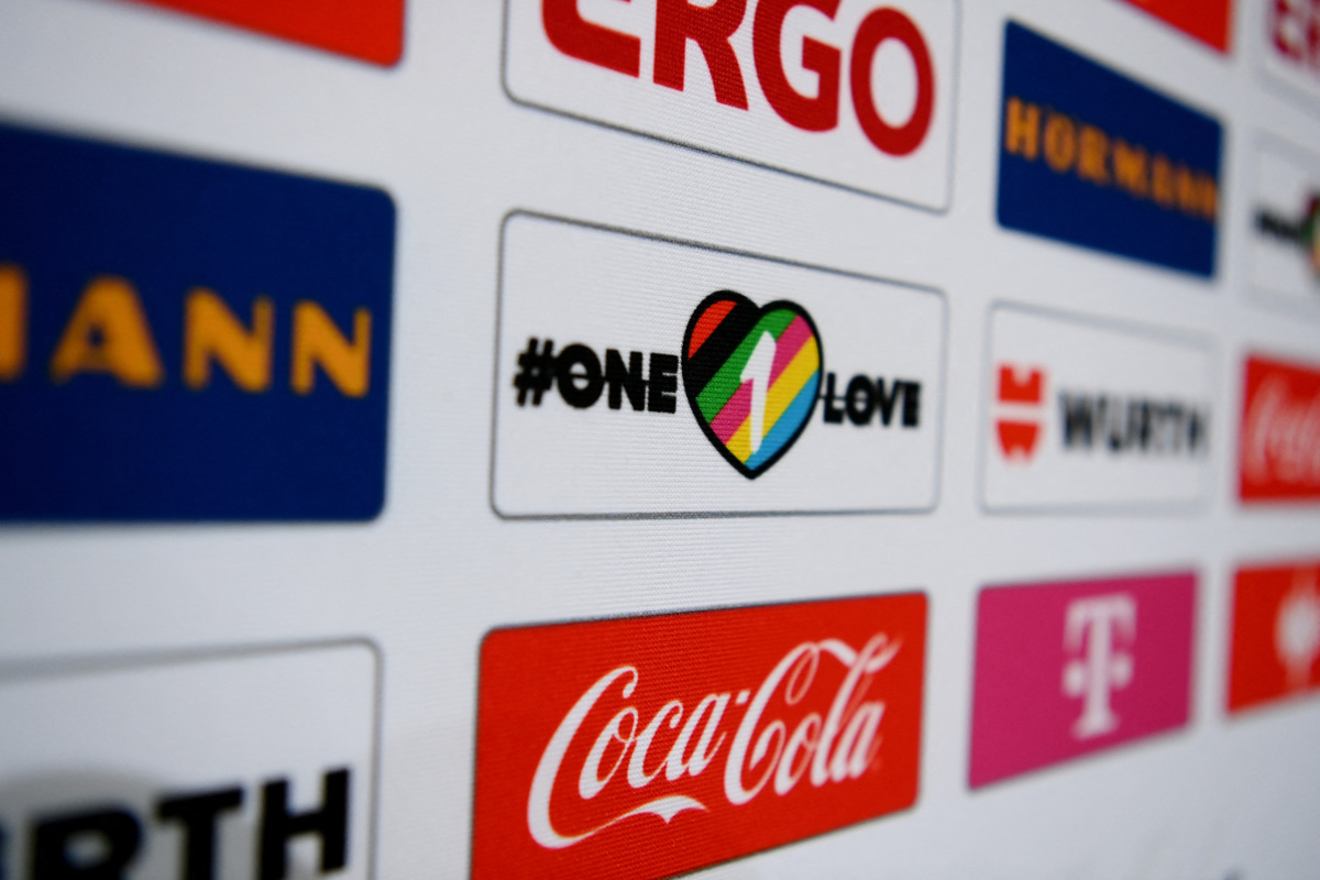 Ο τοίχος της γερμανικής αίθουσας συνεντεύξεων Τύπου που εμφανίζει όλους τους χορηγούς της ομάδας στην προπονητική «βάση» της, στο βόρειο Κατάρ, έχει από σήμερα το λογότυπο “OneLove” και το ουράνιο τόξο στη θέση της αλυσίδας σούπερ μάρκετ REWE που αποχώρησε.