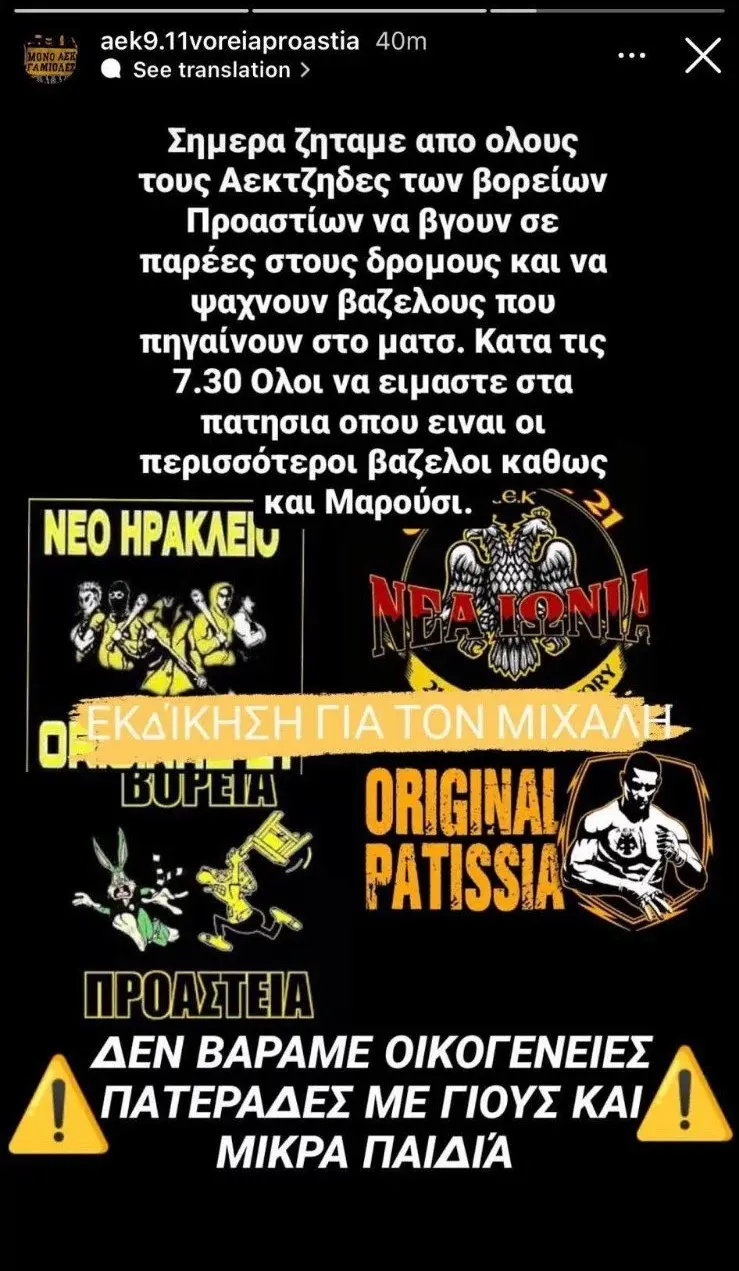 «Σήμερα ζητάμε από όλους τους ΑΕΚτζήδες των βορείων Προαστίων να βγουν σε παρέες στους δρόμους και να ψάχνουν βάζελους που πηγαίνουν στο ματς. Κατά τις 19:30 όλοι να είμαστε στα Πατήσια όπου είναι οι περισσότεροι βάζελοι καθώς και Μαρούσι. ΔΕΝ ΒΑΡΑΜΕ ΟΙΚΟΓΕΝΕΙΕΣ ΠΑΤΕΡΑΔΕΣ ΜΕ ΓΙΟΥΣ ΚΑΙ ΜΙΚΡΑ ΠΑΙΔΙΑ»