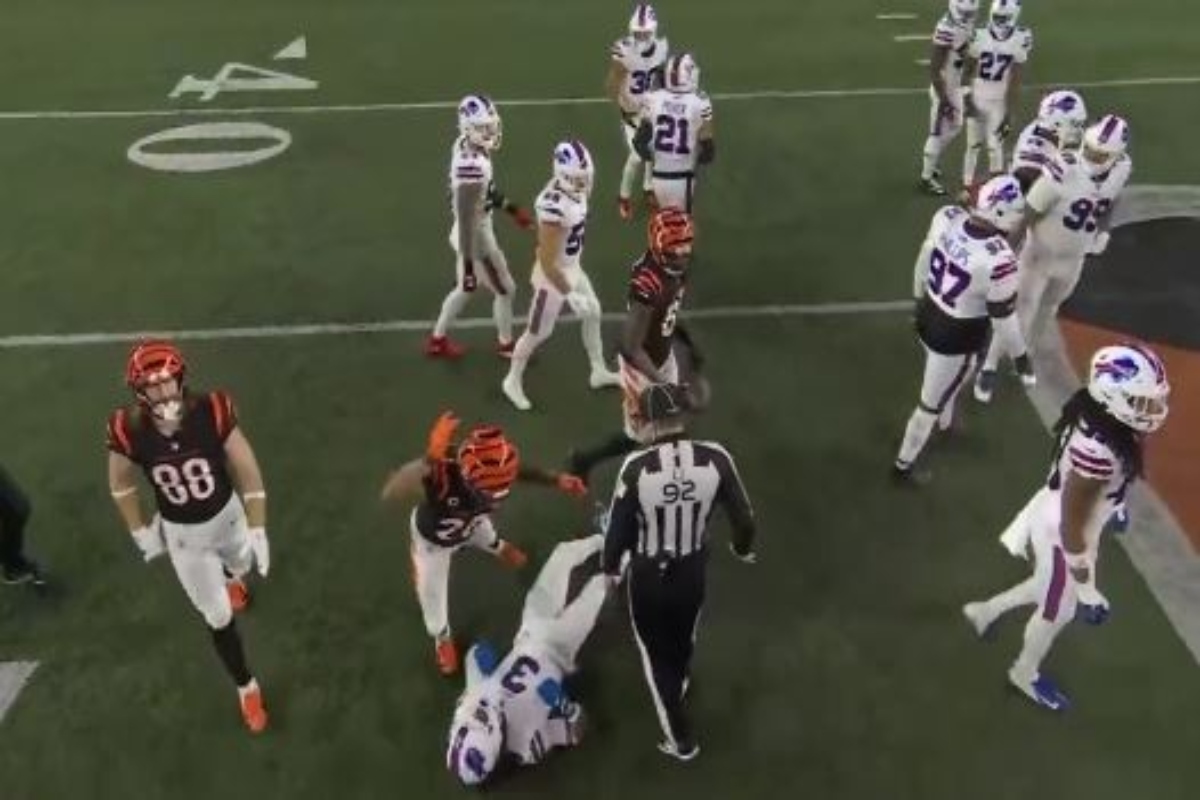 Το παιχνίδι στο Σινσινάτι διακόπηκε καθώς το ιατρικό επιτελείο εισήλθε στον αγωνιστικό χώρο γρήγορα, ενώ οι παίκτες και των δύο ομάδων γονάτισαν.