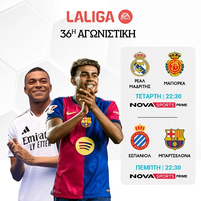 Η συναρπαστική La Liga στην Ισπανία συνεχίζεται στα κανάλια Novasports με διπλή αγωνιστική. Αρχικά το τριήμερο 13-15/5 θα διεξαχθεί η εμβόλιμη 36 η αγωνιστική όπου δεσπόζουν οι αγώνες Εσπανιόλ – Μπαρτσελόνα (15/5, 22:30), Ρεάλ Μαδρίτης – Μαγιόρκα (14/5, 22:30) και Οσασούνα – Ατλέτικο Μαδρίτης (15/5, 20:00). Η συνέχεια είναι την Κυριακή