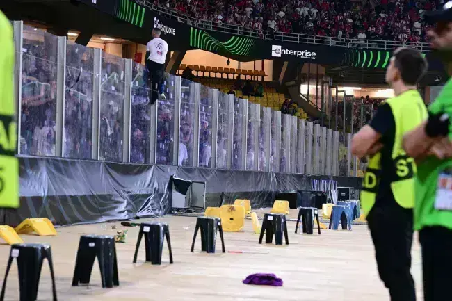 Όπως φαίνεται και στις εικόνες, οι καρέκλες που έσπασαν οι οπαδοί της Φιορεντίνα έχουν διασκορπιστεί δίπλα ακριβώς από τον αγωνιστικό χώρο.