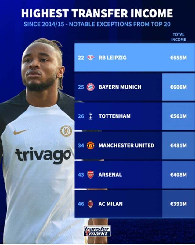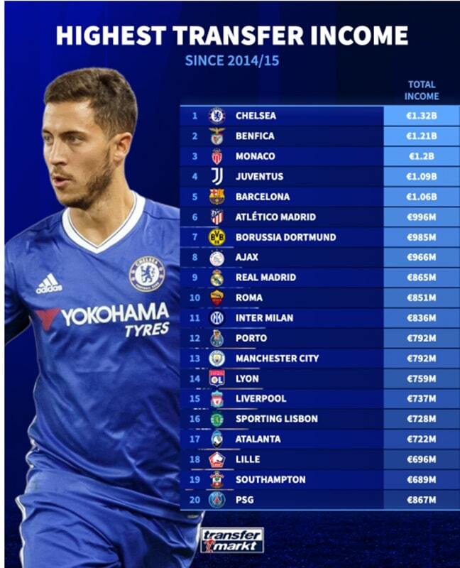 Τα 2,33 δισεκατομμύρια ευρώ που έχει ξοδέψει η Τσέλσι για μεταγραφές τις τελευταίες δέκα σεζόν, της δίνει την πρώτη θέση στην σχετική κατάταξη, αλλά είναι επίσης η ομάδα που επίσης έχει λάβει τα μεγαλύτερα έσοδα από την πώληση παικτών. Η Τσέλσι έχει κερδίσει 1,32 δισ. ευρώ από τις παραχωρήσεις παικτών της από την περίοδο 2014/15.