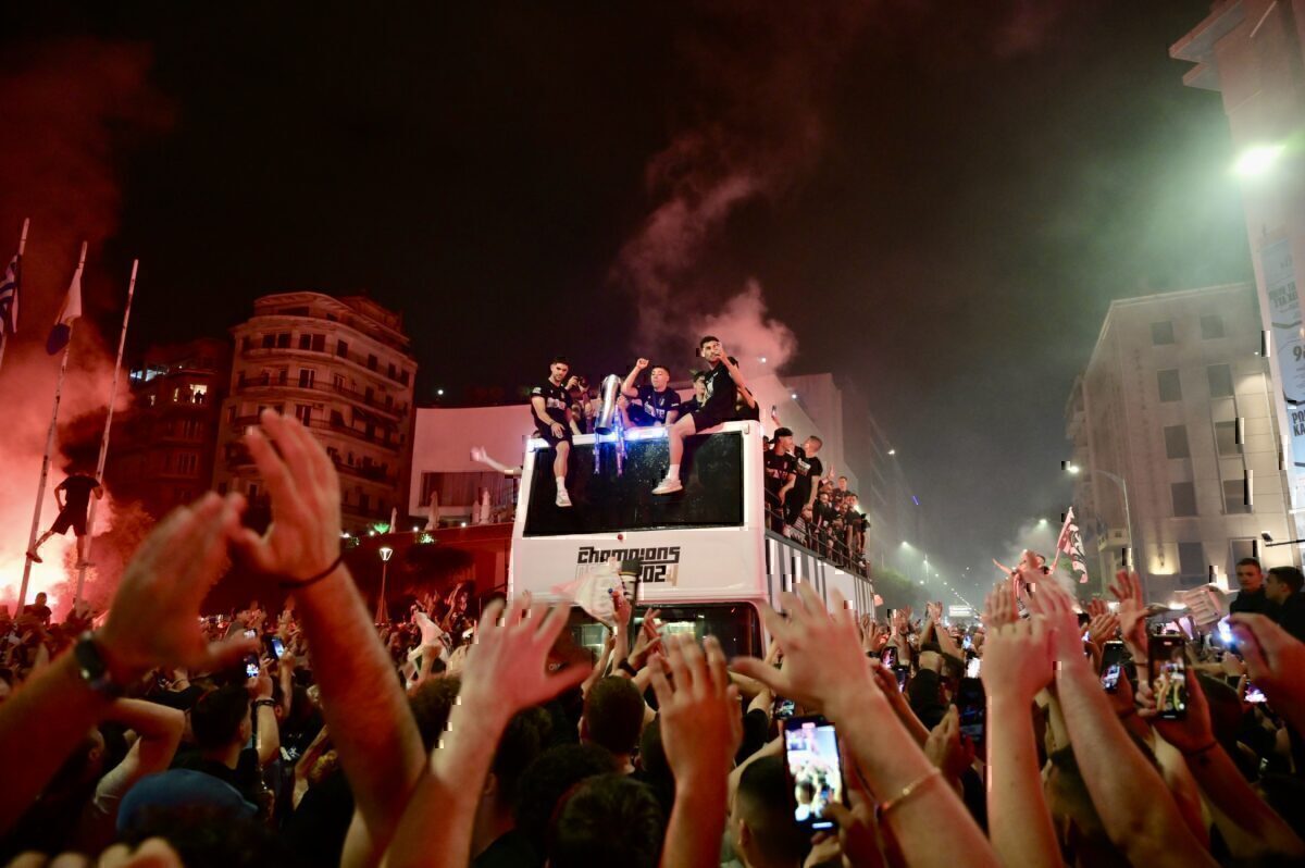 Οι πανηγυρισμοί στην Τούμπα για την κατάκτηση του πρωταθλήματος ολοκληρώθηκαν λίγο πριν τις 2 τα ξημερώματα της Δευτέρας και οι παίκτες και το τεχνικό επιτελείο μπήκαν σε ανοιχτό λεωφορείο όπως είχε γίνει και το 2019 για να αποχωρήσουν από το γήπεδο και να πάνε στον Λευκό Πύργο και τους γύρω δρόμους της Θεσσαλονίκης για να γνωρίσουν την αποθέωση από τον κόσμο.