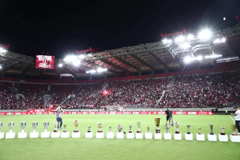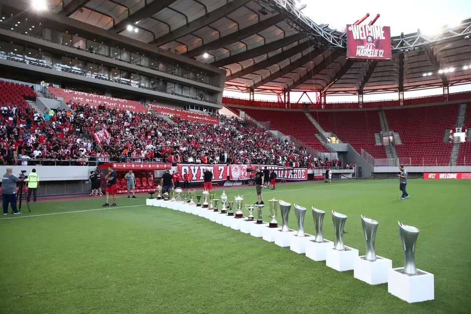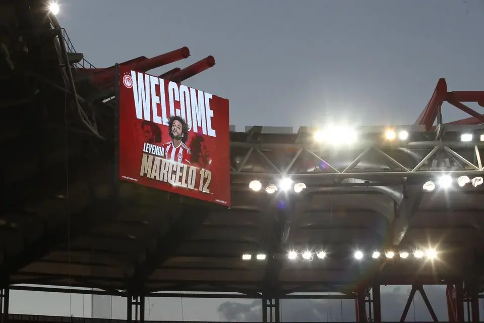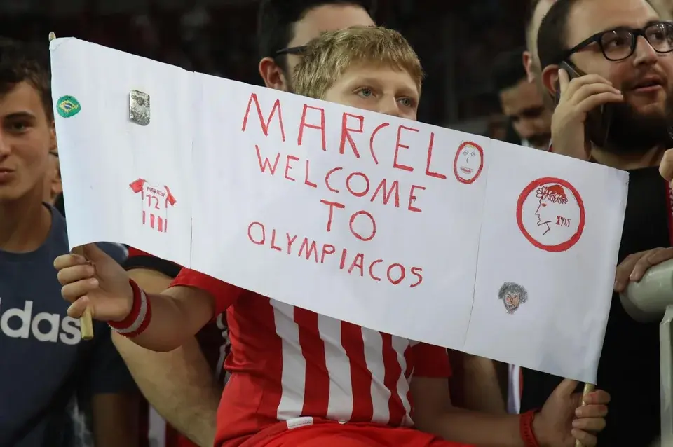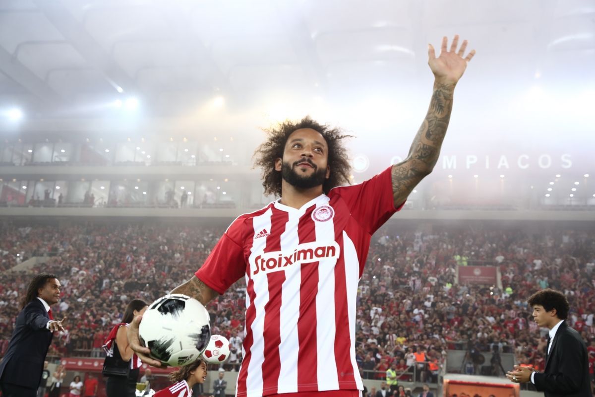 Οι τρομπέτες έπαιζαν το κλασικό τραγούδι του Ολυμπιακού και ο Μαρσέλο χειροκροτούσε, όσο περίπου 20.000 κόσμου φωνάζει “Ολυμπιακός, Ολυμπιακός” και στη συνέχεια έκανε τα δικά του κολπάκια με την μπάλα.