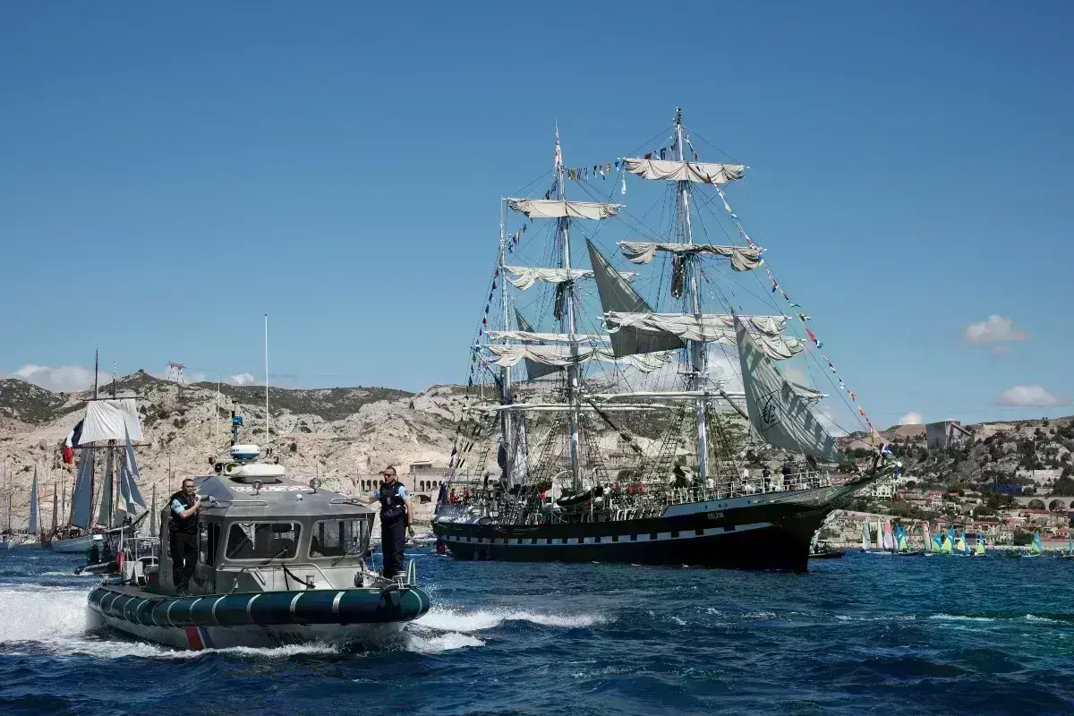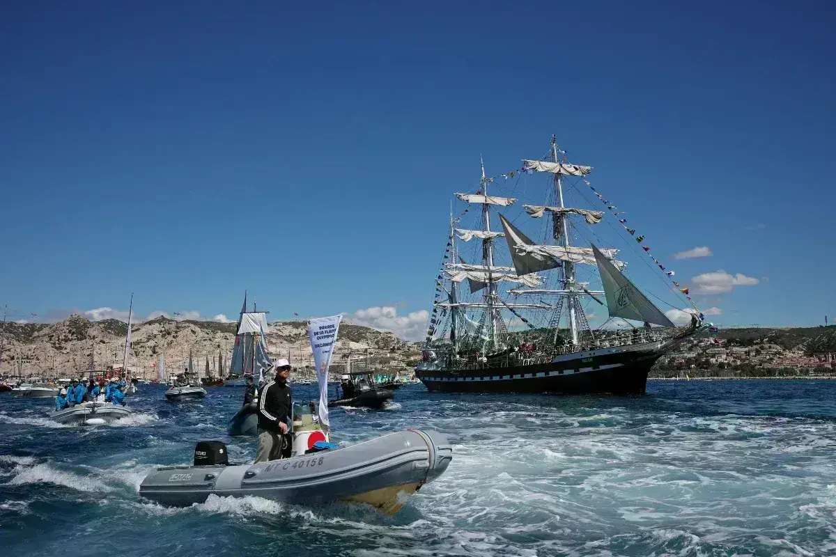Λίγο μετά τις 8:00 σήμερα το πρωί, το θρυλικό τρικάταρτο πλοίο του γαλλικού εμπορικού ναυτικού, που κατασκευάσθηκε το 1896, χρονιά διεξαγωγής των πρώτων σύγχρονων Ολυμπιακών Αγώνων, έφθασε στα ανοιχτά του λιμανιού της Μασσαλίας, κοντά στα νησιά Frioul και στον φάρο Planier, σε μια ήρεμη θάλασσα και κάτω από έναν λαμπερό ήλιο.