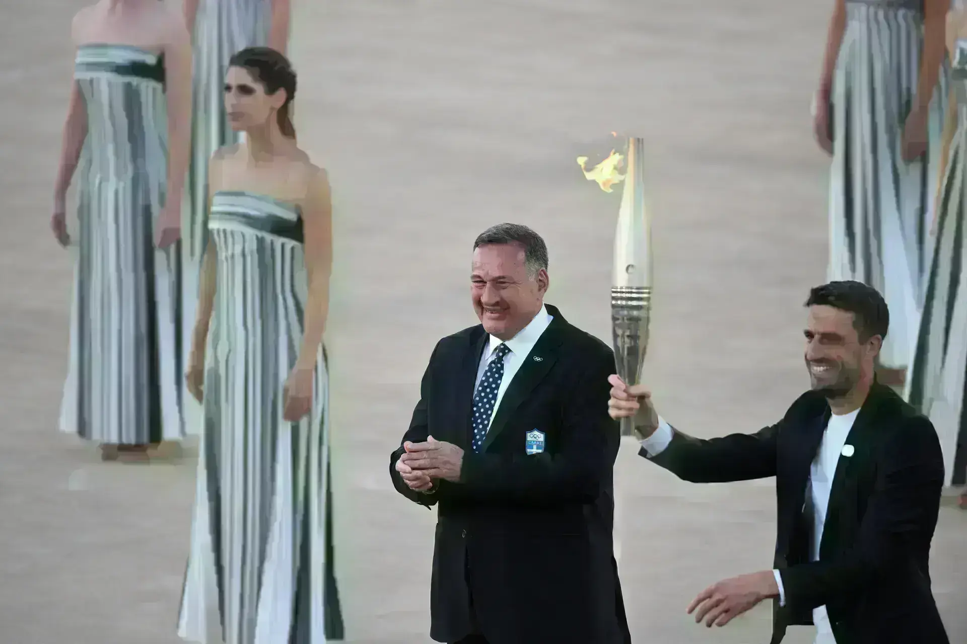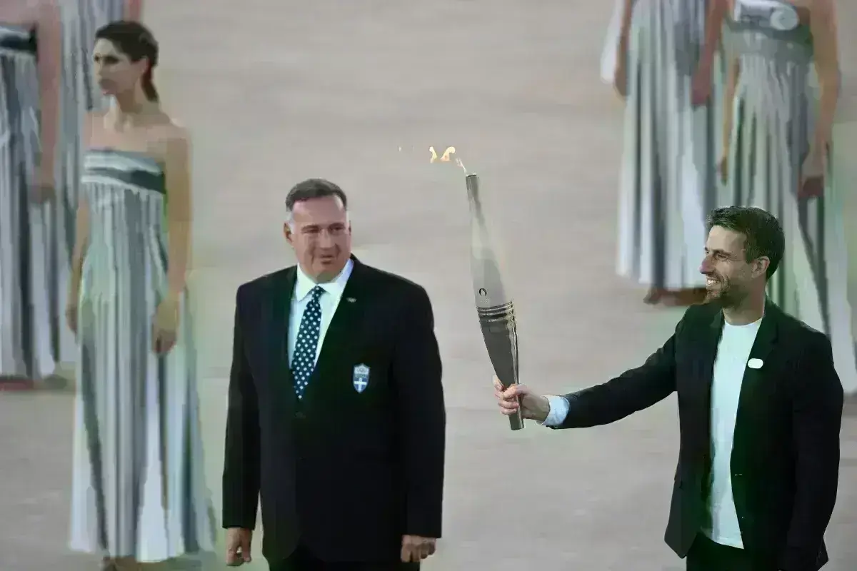 Ο Πρόεδρος της Ελληνικής Ολυμπιακής Επιτροπής και μέλος της Διεθνούς Ολυμπιακής Επιτροπής στην Ελλάδα, Σπύρος Καπράλος, παρέλαβε τη φλόγα από την Πρωθιέρεια ,Μαίρη Μηνά και με τη σειρά του την παρέδωσε στον Πρόεδρο της Οργανωτικής Επιτροπής «PARIS 2024» Τόνι Εσταγκέ (τρεις φορές ολυμπιονίκης στο σλάλομ κανό), για να συνεχίσει το ταξίδι του για το Παρίσι.