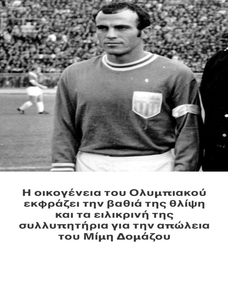 «Η οικογένεια του Ολυμπιακού εκφράζει την βαθιά της θλίψη και τα ειλικρινή της συλλυπητήρια για την απώλεια του Μίμη Δομάζου», έγραψαν οι ερυθρόλευκοι σε Story στο Instagram.